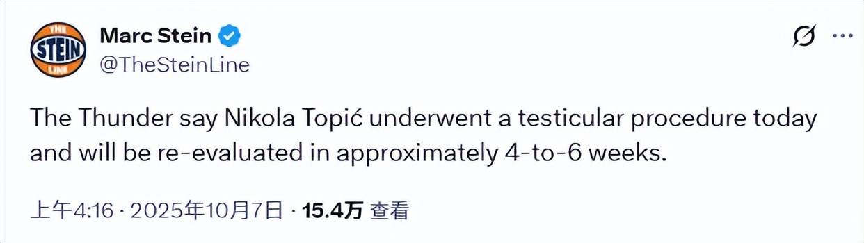 点击次数: 北京时间10月7日雷霆队后卫尼古拉-托皮奇因前十字韧带撕裂缺席了整个新秀赛季,而在他的第二个NBA赛季开启时,他仍将无法出战。雷霆已宣布,托皮奇于当地时间周一接受了睾丸相关手术,预计4至6周后将重新评估恢复情况。这意味着他的NBA常规赛首秀最早也要等到11月才能上演。