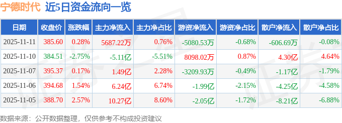 点击次数: 证券之星消息,截至2025年11月11日收盘,宁德时代(300750)报收于385.6元,上涨0.28%,换手率0.45%,成交量19.3万手,成交额75.0亿元。